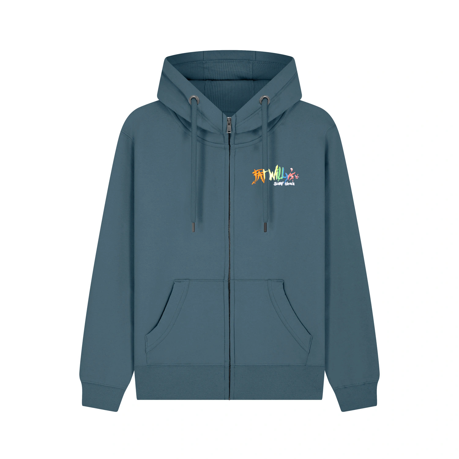The five colour Fat Willy’s branding featured on the front as well as the back and comes with the Newquay or Falmouth location. This Fat Willy’s Adult Zipped Hoodie is versatile, long lasting and iconic.