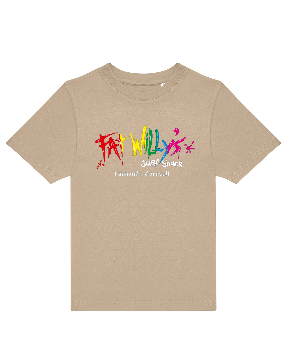 This Kids Fat Willy’s T-shirt in Sand is classic retro branding and comfortable casual wear come together. Perfect for those summer beach days and also to wear under one of our kids hoodies. This Kids Fat Willy’s T-shirt features the iconic Cornish five colour Fat Willy’s Falmouth, Cornwall logo on the front and back. Available in a unisex style, also in several different colours.